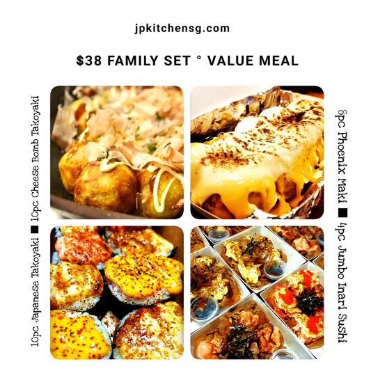 FAMILY SET : $40 (10pc takoyaki + 10pc cheesebomb takoyaki + 1 phoenix maki + 5pc mix inari)